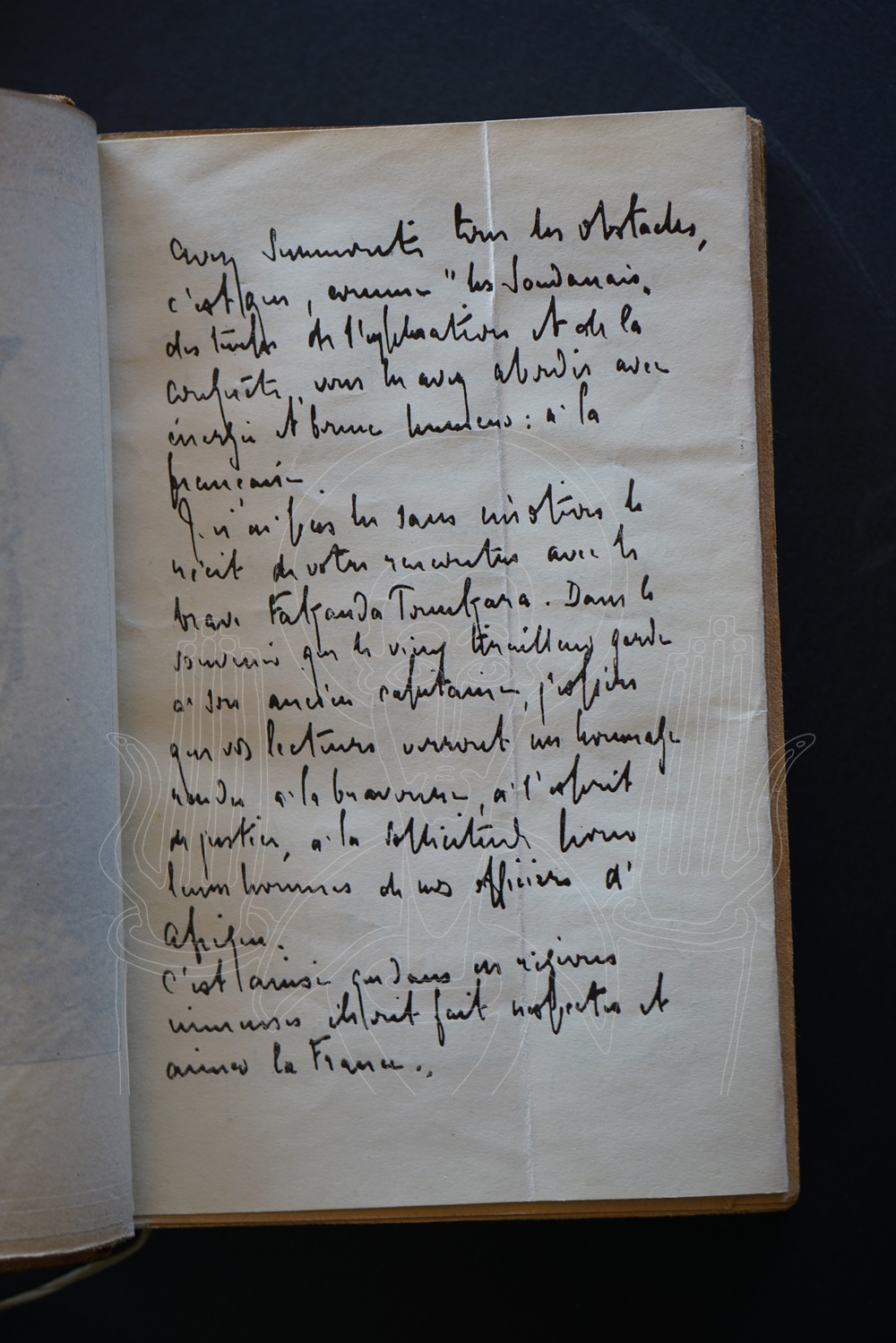 In-8°, 278 p., nombreuses photographies hors-texte en noir et blanc et cartes d’Afrique dont certaines dépliantes, reliure demi-basane havane avec dos richement orné à six nerfs et pièces de titre et nom de l’auteur en cuir noir. Couvertures conservées. Edition originale avec mention fictive de troisième édition sur la couverture avec un très long envoi autographe de l’auteur parlant de « la traversée du Continent noir d’un bout à l’autre » et une carte dépliante manuscrite non reliée de l’Afrique avec le trajet fait par l’auteur de l’Ouest à l’Est représenté à l’encre rouge (mission Tranin / Duverne).