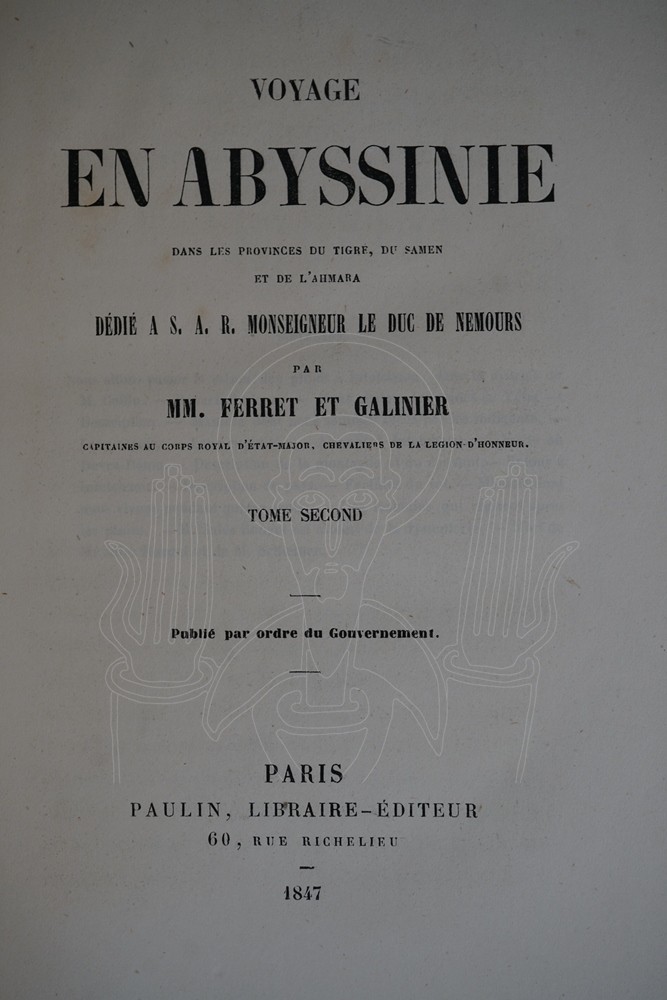 Ce voyage complet du 3ème tome dont Fumagalli et Milkias ignorent l’existence et de l’atlas ici en 2 tomes est une belle pièce de collection. Ferret et Galinier appartiennent à la pléïade des voyageurs français qui ont investi l’Ethiopie sous la Monarchie de Juillet.