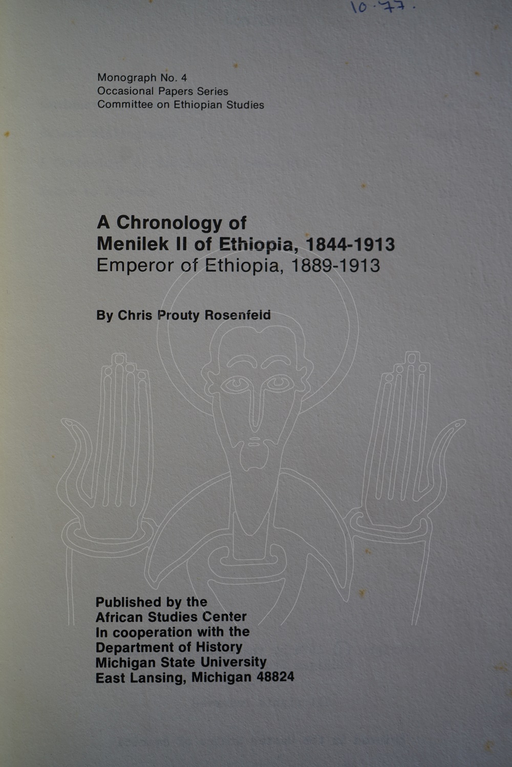 1976 : PROUTY ROSENFELD (Chris), A Chronology of Menilek II of Ethiopia, 1844-1913; Emperor of Ethiopia, 1889-1913.