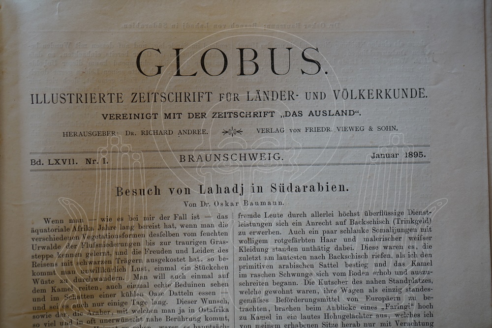 Globus, illustrierte Zeitschrift für Länder- und Völkerkunde, 67. Band, u.a. Baumann, "Besuch von Lahadj in Südarabien", S. 1-6, mit Abb.