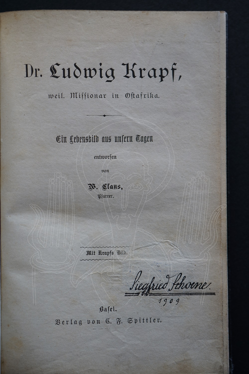 Claus stützte sich neben Krapfs Schriften auf dessen Briefe im Basler Missionsarchiv sowie auf Beiträge, die ihm ehemalige Missionskollegen im Basler Missionshaus zur Verfügung stellten.