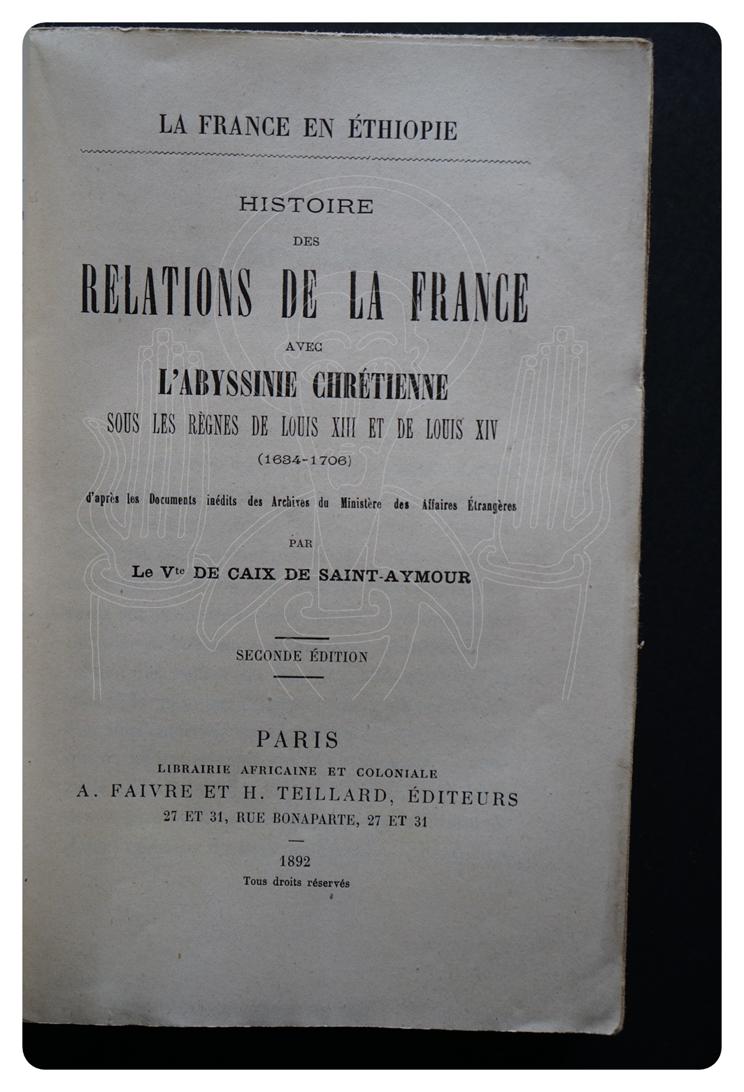Histoire des relations de la France avec l’Abyssinie chrétienne sous les règnes de Louis XIII et de Louis XIV (1634-1706).