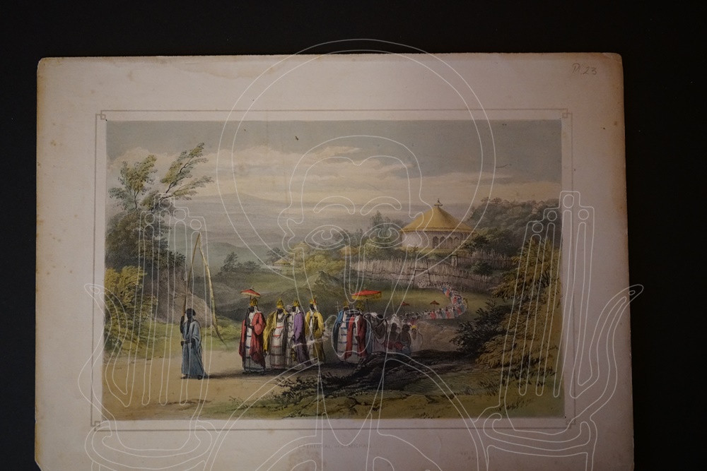s.d. [1845], 4 p. l., 26 pl. front. (port.); 37 cm. Collection biblethiophile: 9 planches sur 26, (1) Sultan of Tajura; (8) Eesah Somauli; (11) Woema Shepherdesses; (12) The Wady Killulloo; (13) Presentation at Court; (19) Mohammadan Women of Argobba; (21) Interior of an Abyssinian House; (23) Cathedral of St Michael; (25) Triumphal Entry into Angollala (two illustrations)