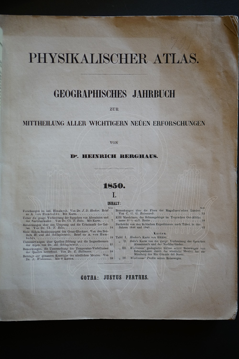 First edition. 4to. pp. [iv], 64; three maps and one profile; corners bumped, else good in the original printed wrappers with paper label, slightly worn. Berghaus was a German geographer best known for his cartographic work. His Physikalischer Atlas ran for four volumes from 1850-52, and was continued by Petermanns Geographische Mitteilungen. This issue of the work contains Joseph Dalton Hooker's 'Forschungen im östlichen Himalayah' based on his letter to A. von Humboldt, with an accompanying map. This issue also contains two articles by Charles Beke on Abyssinia (one with map), two articles by the Schlagintweits on the Alps, and a notice concerning Kilimandjaro.